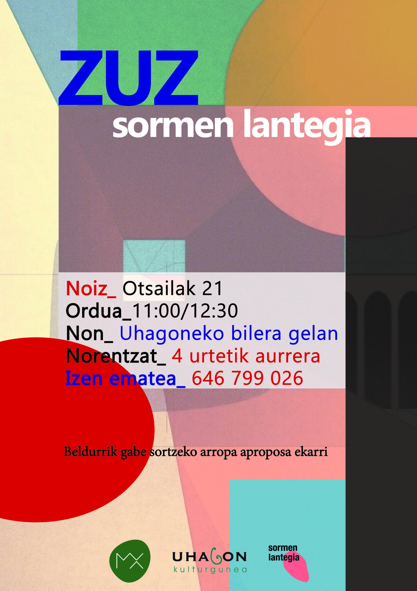 Informazio gehiago"ZUZ" SORMEN LANTEGIA 11:00 - 12:30 4 urtetik aurrera Izen-ematea: 646 799 026 Beldurrik gabe sortzeko arropa aproposa ekarri