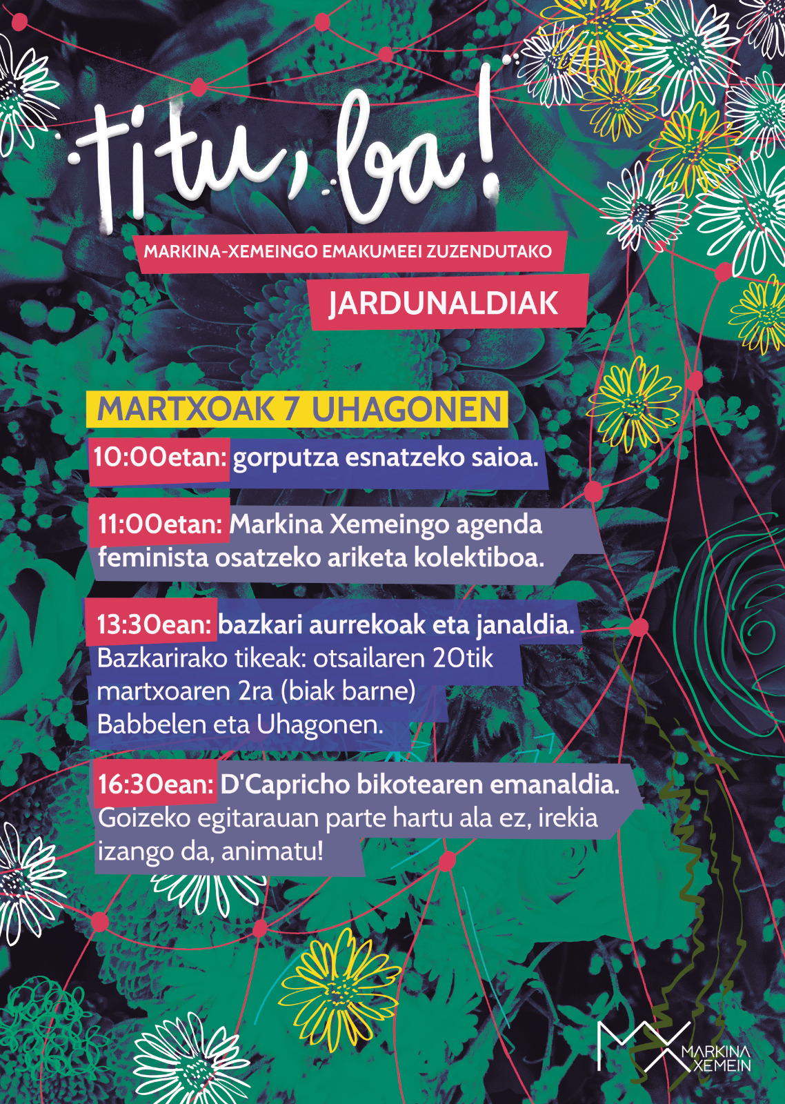 Informazio gehiago"TITU, BA! JARDUNALDIAK" EMAKUMEEN NAZIOARTEKO EGUNA 10:00: gorputza esnatzeko saioa. 11:00: herriko agenda feminista osatzeko ariketa kolektiboa. 13:30: EMEKI korala kalez kale Uhagonetik hasita. Bazkaria. 16:30: D’Capricho bikotearen emanaldia.